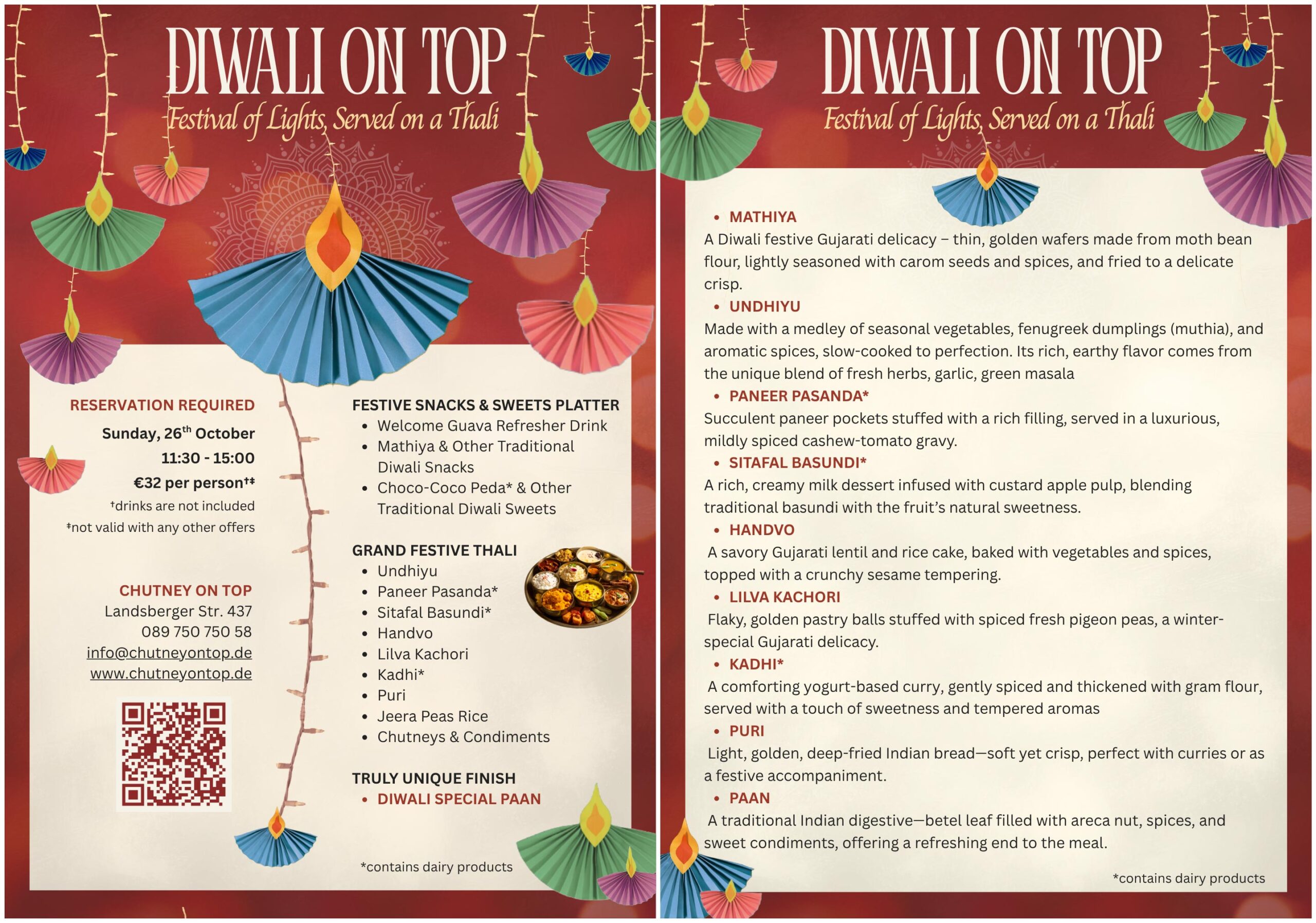Celebrate this Diwali with a feast that shines as bright as the Festival of Lights itself. Enjoy our exclusive Diwali Special Thali — starting with festive snacks and sweets, followed by a grand spread of traditional delicacies like Undhiyu, Handvo, Kachori, Sitafal Basundi, and more. Conclude on a truly unique note with our Diwali Special Paan.
